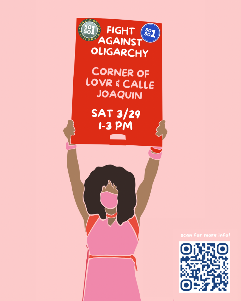 We will meet at the corner of Los Osos Valley Road and Calle Joaquin at 1PM, and march (sidewalks and crosswalks only) to the freeway overpass and back to the Tesla dealership. Bring signs, bring friends, and DO NOT engage counter protesters!