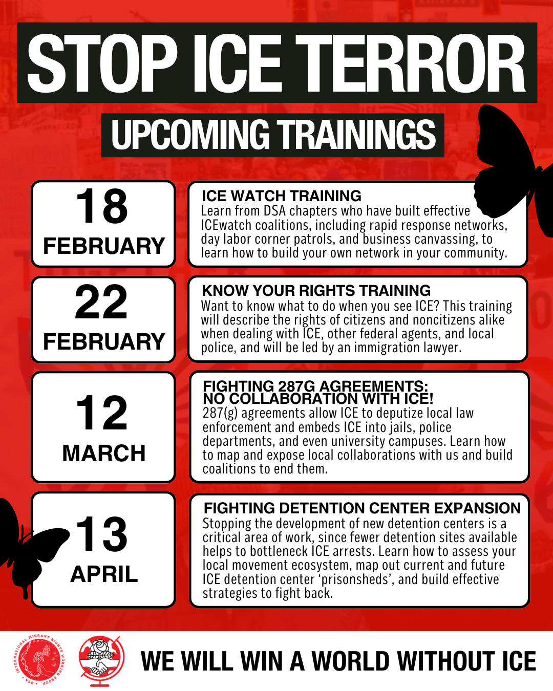 At the beginning of the second Trump administration, 90% of the country’s 41,500 immigration detention beds were owned or operated by private prison companies. Now, after a year of congressional capitulation and the enormous increase in DHS funding, the Trump administration is proposing to vastly increase is immigration detention bedspace, mostly through private contractors and non-traditional prisons such as converted warehouses. Stopping these is a critical area of work, since fewer detention sites available helps to bottleneck ICE arrests, and cooperation from local governments and private corporations is necessary to permit and operate these facilities. Both are vulnerable to public pressure and present key opportunities for chapters to develop long-term campaigns in strategic collaboration with broad coalitions of migrant rights organizations.
