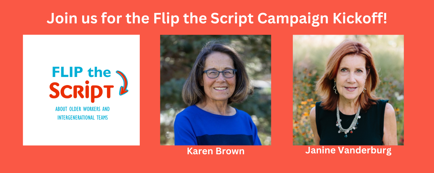 On April 15, join Janine Vanderburg, CEO of Encore Roadmap and Co-chair of The Encore Network Advocacy Committee, and Karen Brown, CEO of iAging and Chair of the Colorado Commission on Aging's Workforce Committee, for a kickoff event to learn more about effective messages and the toolkits they've created to make it easy for anyone to participate in May's Flip the Script campaign.