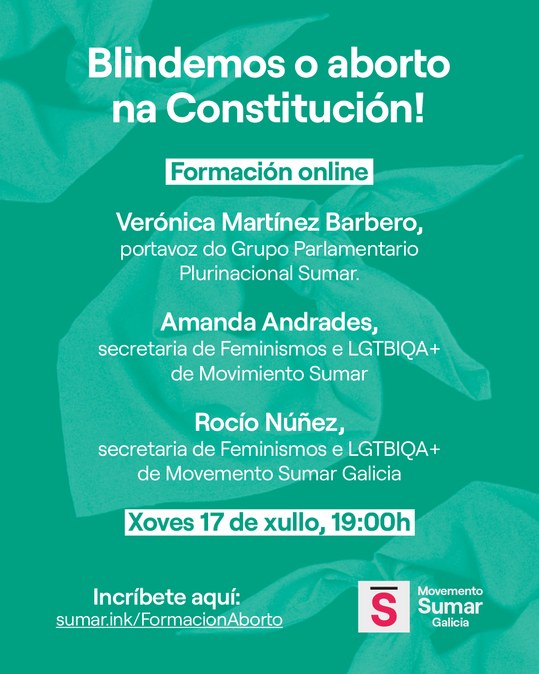 Este xoves 17 de xullo as 19:00 invitámoste a falar sobre o aborto e a súa inclusión na Constitución Española ca portavoz do Grupo Parlamentario, Verónica Martínez Barbero, a secretaria de Feminismos e LGTBIQA+ de Movimiento Sumar, Amanda Andrades e a secretaria de Feminismos e LGTBIQA+ de Movemento Sumar Galicia, Rocío Núñez.