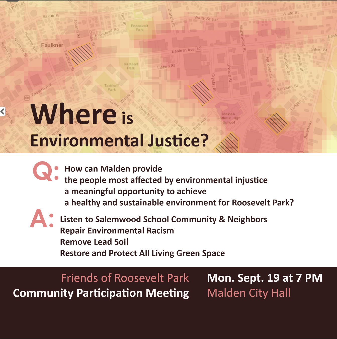 Please join us next Monday. September 19th at 7pm to for the FORP’s Community Participation Meeting Roosevelt Park. This is conversation that is sorely needed so that all of Malden voices can be heard. This is YOUR meeting lead by FoRP and is not run by the City of Malden. We welcome you to come, share your stories and your support for the park’s full decontamination from lead and for keeping Roosevelt Park a living green grass park for the kids today and tomorrow!
