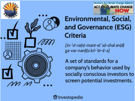 Fossil-Free Arizona! Invites you to an educational event about ESG (Environmental, Social, Governance) and why it matters. The event will address the increasingly virulent anti-ESG political effort in Arizona that seeks to restrict local governments from investing in companies that use ESG criteria to manage risk and promote social justice and environmental stewardship, including climate action.
