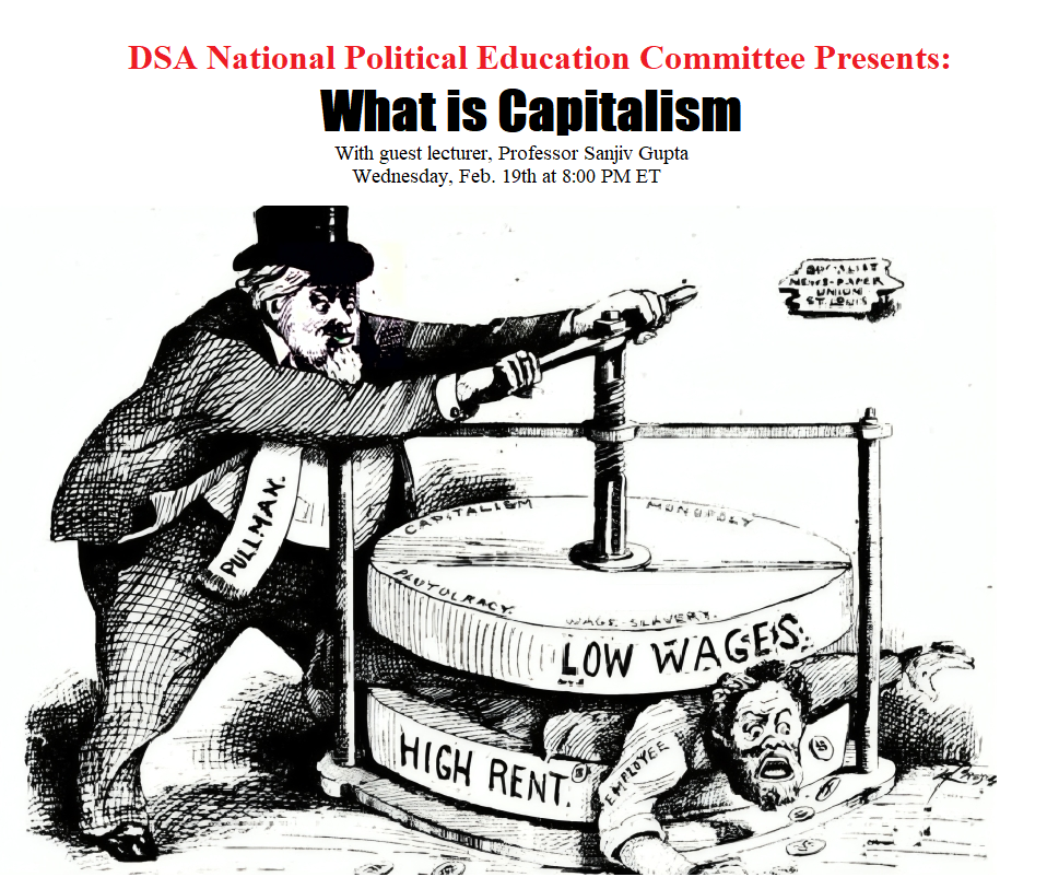 Please join us for DSA's three-part Foundational Political Education series, featuring presentations by Professor Sanjiv Gupta and our DSA National Co-Chairs Megan Romer and Ashik Siddique on the subjects of capitalism, socialism, and the working class. Combined, these three presentations create a solid foundation for understanding the contemporary world and a possible alternative.