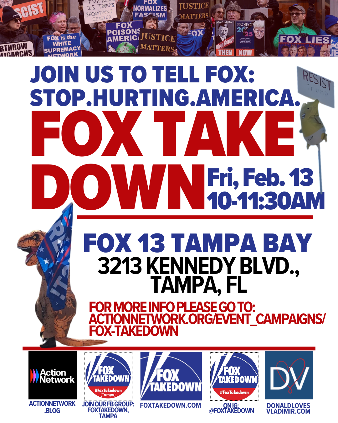This Friday, local Tampa Bay activists will protest in front of FOX13 (3213 W Kennedy Blvd, Tampa, FL 33609) for public awareness of MAGA misinformation propagated by FOW NEWS. FOX13 Station is chosen because of location and name recognition.