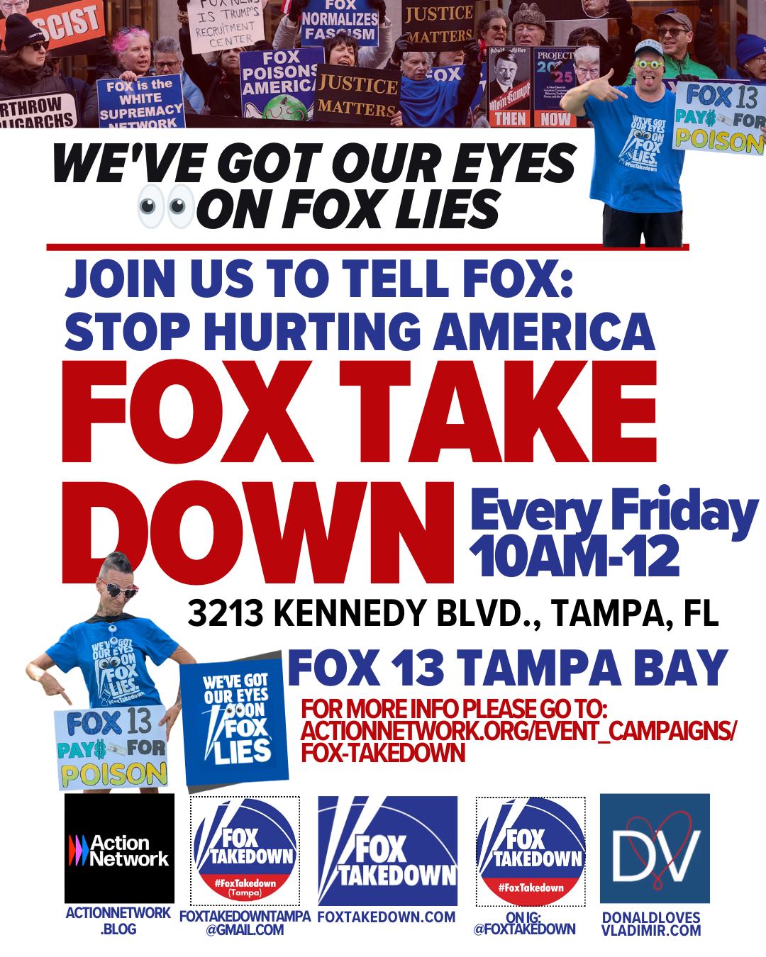 Please join us on Fridays from 10AM-Noon in Tampa to push back against the most destructive immigrant to ever hit our shore...Rupert Murdoch- and to tell FOX13 that We've got our EYES on the Lies, and we want Fox13 to STOP FUNDING FOX & Rupert Murdoch's propaganda campaigns!