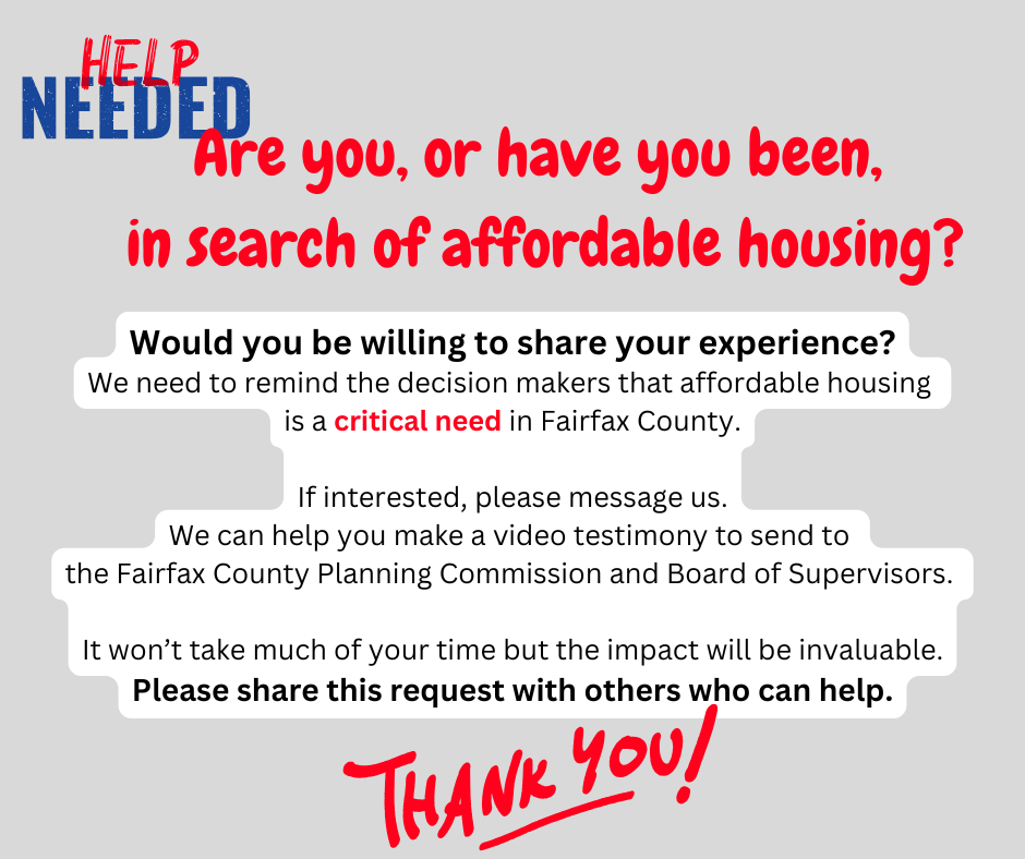I'd like to offer a special "Thank You" to the Franconia Housing Advocates, St. Martin de Porres Episcopal Church, and the Fairfax County NAACP for helping to organize this event.