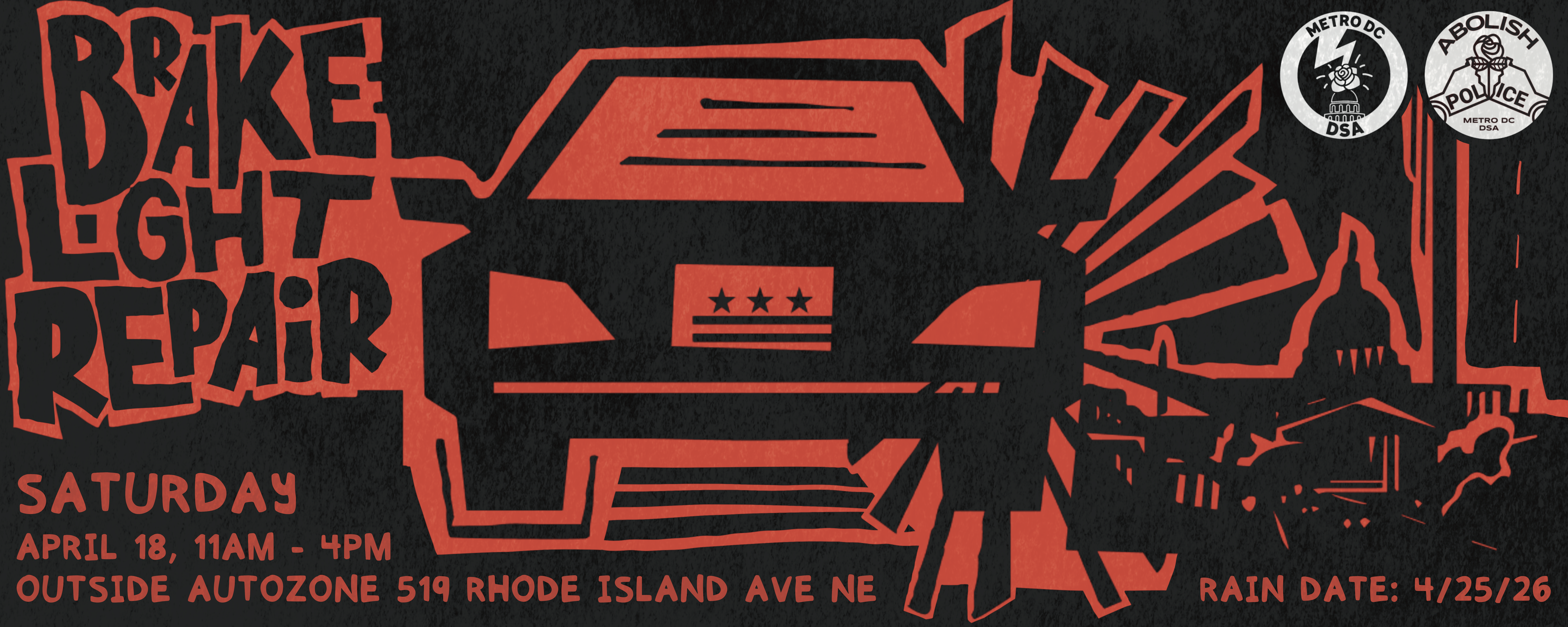Do you or someone you know have a car with a broken brake or tail light? Metro DC DSA is hosting a free Brake Light Repair Clinic! Stop by and we’ll replace your broken light for free while we learn more about how we can have safer streets without police.