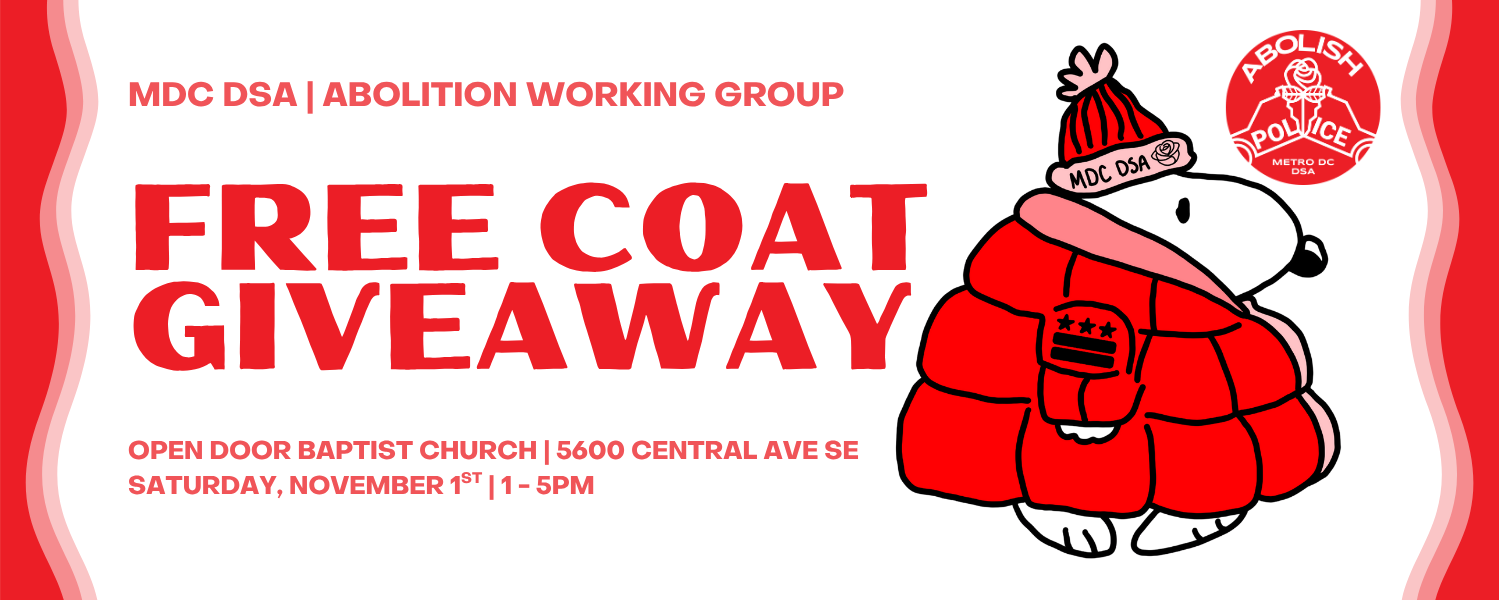 Metro DC DSA’s Abolition Working Group is hosting free coat giveaway on Saturday, November 1st. We’ll distribute coats to all who need them - no questions asked, no barriers.