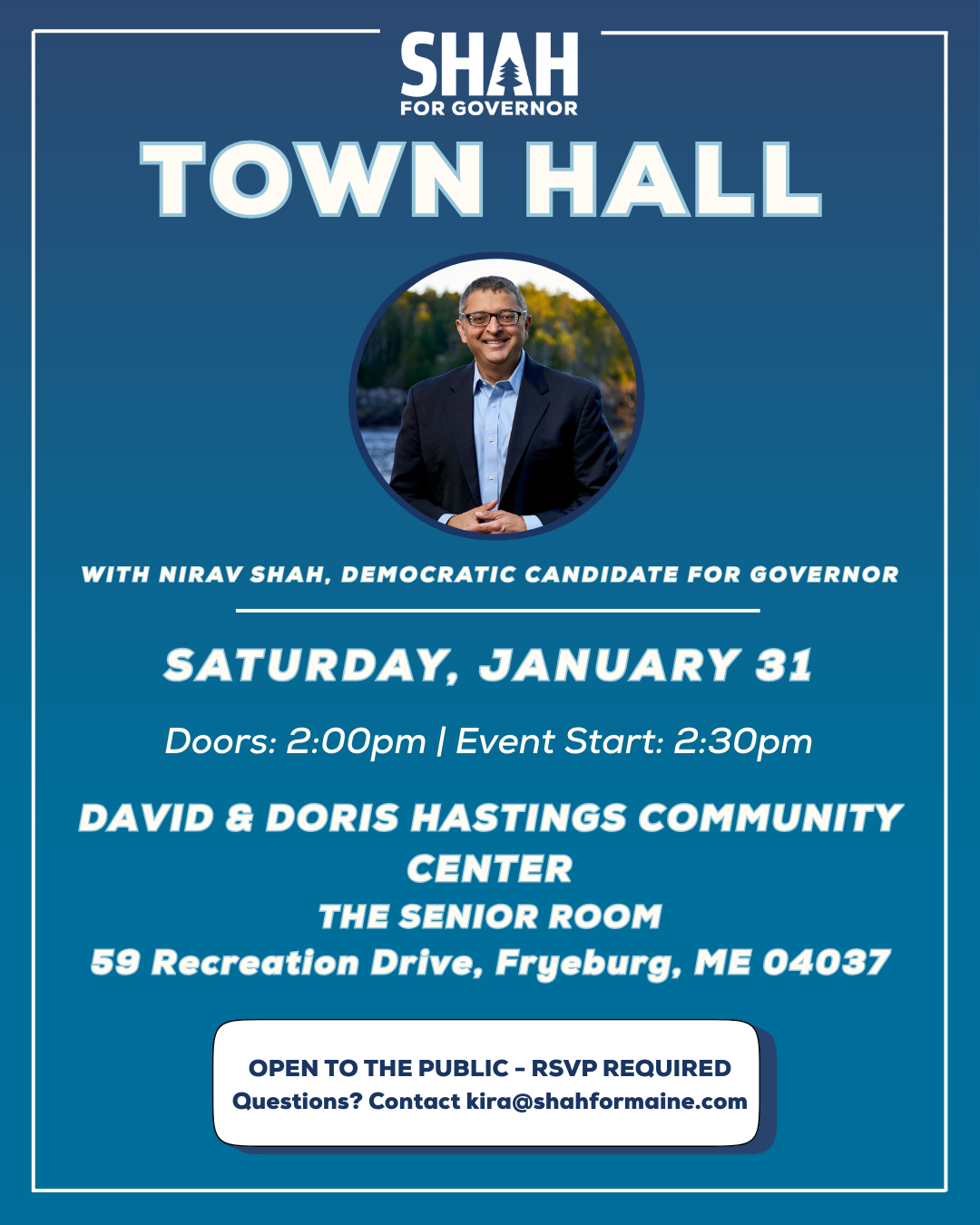We’re excited to invite you to a Town Hall in Fryeburg with Democratic gubernatorial candidate Nirav Shah.