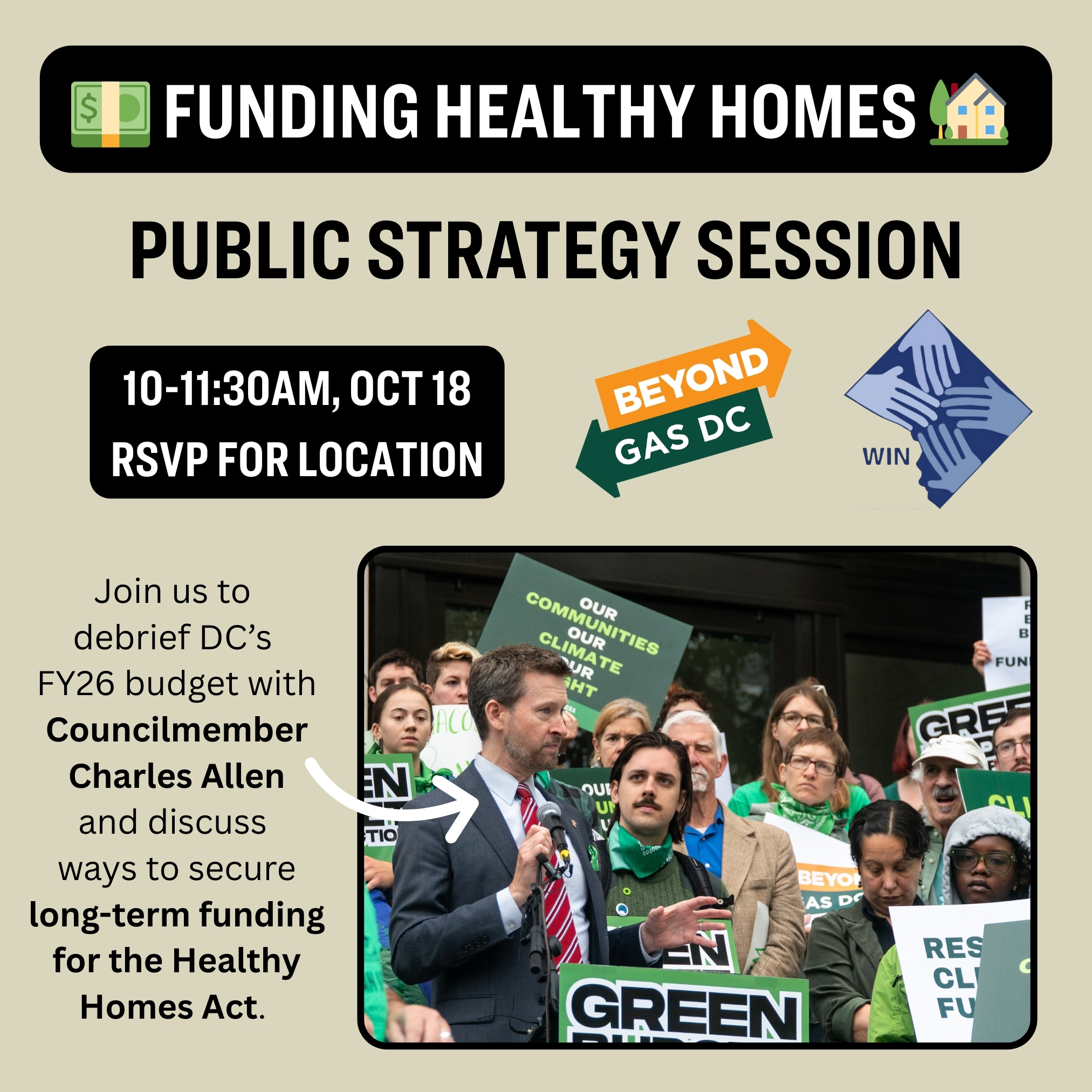 This budget season was tough. Together, we were able to restore some funding to the Healthy Homes Act, but at the end of the day it will not go as far as DC families need. But our fight is far from over. Join BeyondGas for a public meeting with Councilmember Charles Allen, Chair of the Transportation & Environment Committee, where we’ll evaluate this past budget season together and name what worked, what didn’t, and what we’re still owed. Together, we will chart a path forward for securing stronger and more sustainable investments in Healthy Homes. This is an opportunity to hear about where our campaign stands, to envision new funding streams that cannot be raided by the Mayor each year and and build the strategy needed to win greater funding in years to come. Join us to help expand District resources for Healthy Homes and ensure every DC resident has access to safe, healthy, and affordable housing.