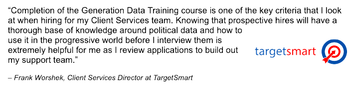 Generation Data alumni have gone to work for organizations including AFSCME, America Votes, Color of Change, DigiDems, the DNC (and multiple state parties), Grow Progress, Planned Parenthood, Relentless, SEIU, State Voices, Sunrise Movement, TargetSmart, and United We Dream among others.