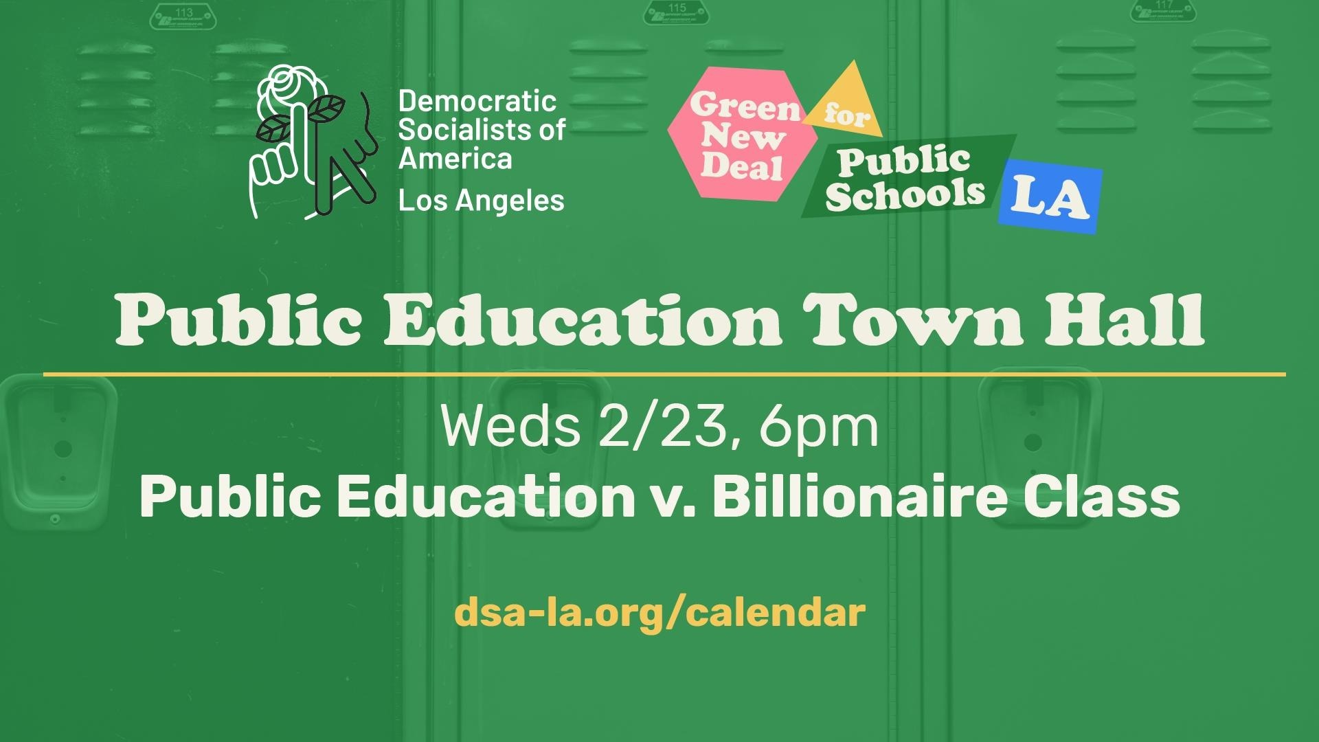 The first installation of our town hall series is "Public Education v Billionaire Class". In this town hall, we will discuss how public schools can become sites for class struggle and how LA has become one of the key battlegrounds in the fight over school privatization.