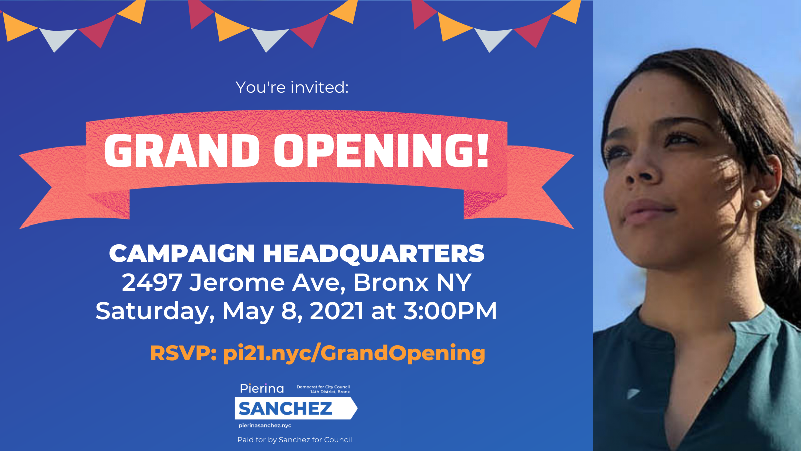 SAVE THE DATE! Join Pierina Sanchez and special guests for the grand opening of our campaign headquarters! We'll have food, beverages, and music -- come and learn more about how to get involved with our campaign over the final 6 weeks until Election Day!