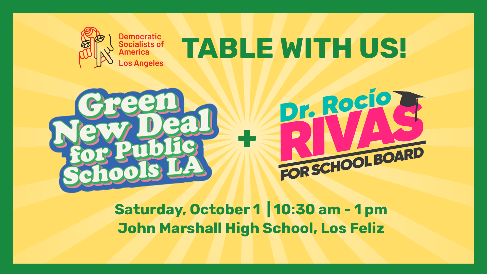 Join us in Los Feliz on October 1, 2022, at 10:30 AM to table with DSA-LA endorsed school board candidate Rocío Rivas and the Green New Deal for Public Schools LA working group and have discussions with community members around John Marshall High School about the need to invest in our public schools so they are climate resilient learning environments that nurture students and prepare our communities to take on the climate crisis.