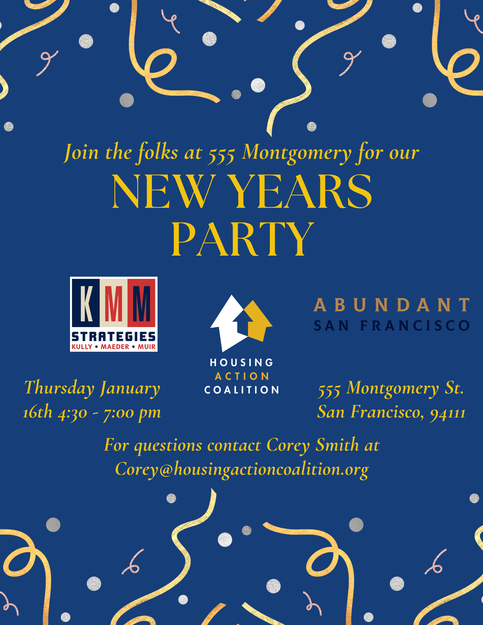 Come celebrate the new year with the people at 555 Montgomery Street! Join the Housing Action Coalition, AbundantSF, KMM Strategies and CA YIMBY for some new year cheer.