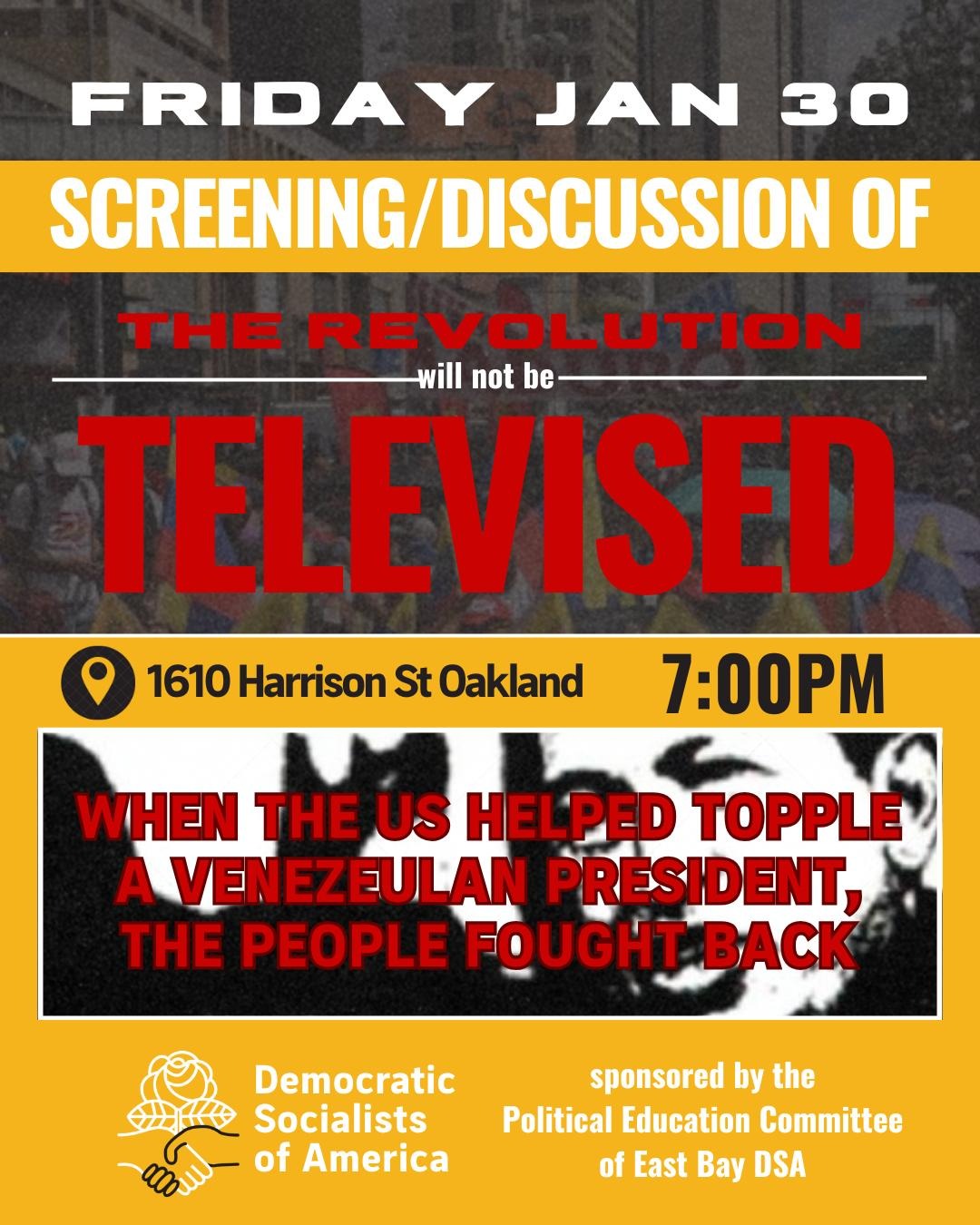 The Political Education Committee of East Bay DSA invites you to a screening of "The Revolution Will Not Be Televised," a stirring documentary about the days in 2002 when the US helped topple the President of Venezuela, Hugo Chávez, and how the response of the people led to a surprising and powerful outcome. After the movie, we will have time for a short discussion on the Bolivarian Revolution and the current attacks by the US on the country, including the kidnapping of President Nicolás Maduro and his wife.