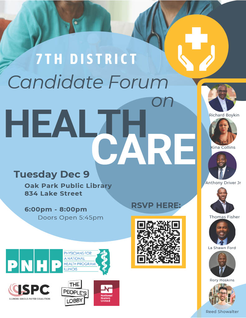 The Illinois Chapter of Physicians for a National Health Plan (PNHP), National Nurses United, The People's Lobby and ISPC, are hosting a 7th Congressional District Candidate Forum on Health Care. The candidate forum will take place on Tuesday December 9, from 6 PM - 8 PM at the Oak Park Public Library at 834 Lake St. in Oak Park, 60301.