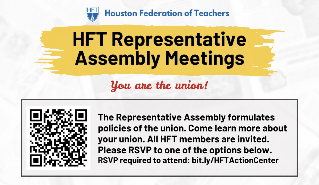 Representative Assembly meetings will encompass issues and happenings affecting HFT members, along with select business items that need to be voted on by the campus stewards such as formulating policies for the HFT. That is why having one steward/representative for each campus in HISD is necessary- one steward, one vote.