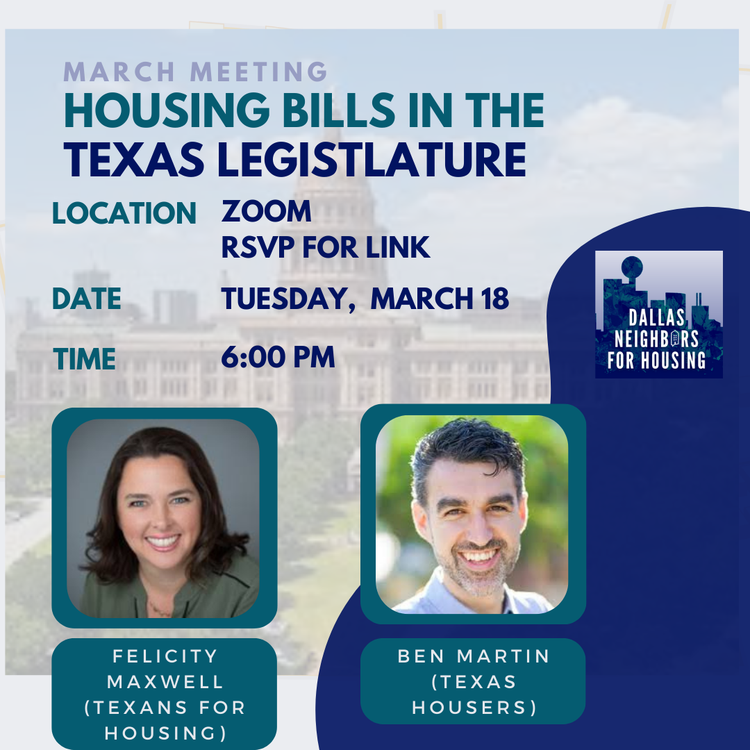 To discuss the different bills, we are hosting two experts: Felicity Maxwell, the Executive Director of Texans for Housing, and Ben Martin, the Research Director for Texas Housers. Texans for Housing focuses on removing barriers to building housing while Texas Housers focuses on tenants rights and expanding access to affordable housing.