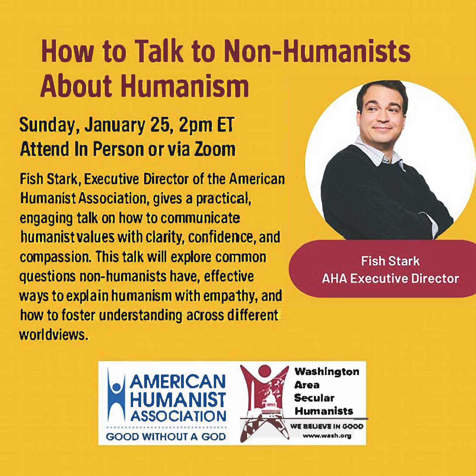 Interested in learning how to talk to non-humanists about your values and be better understood instead of judged? Come join us in DC to hear how American Humanist Association's Executive Director Fish Stark does it.