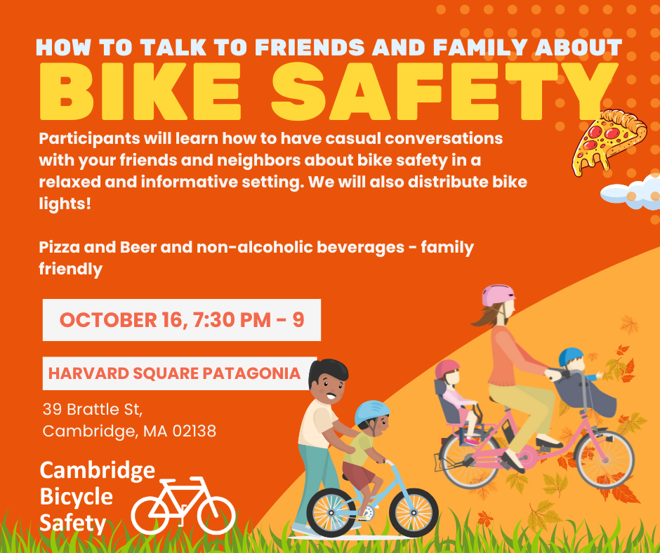 Participants will learn how to have casual conversations with your friends and neighbors about bike safety in a relaxed and informative setting. We will also distribute bike lights!