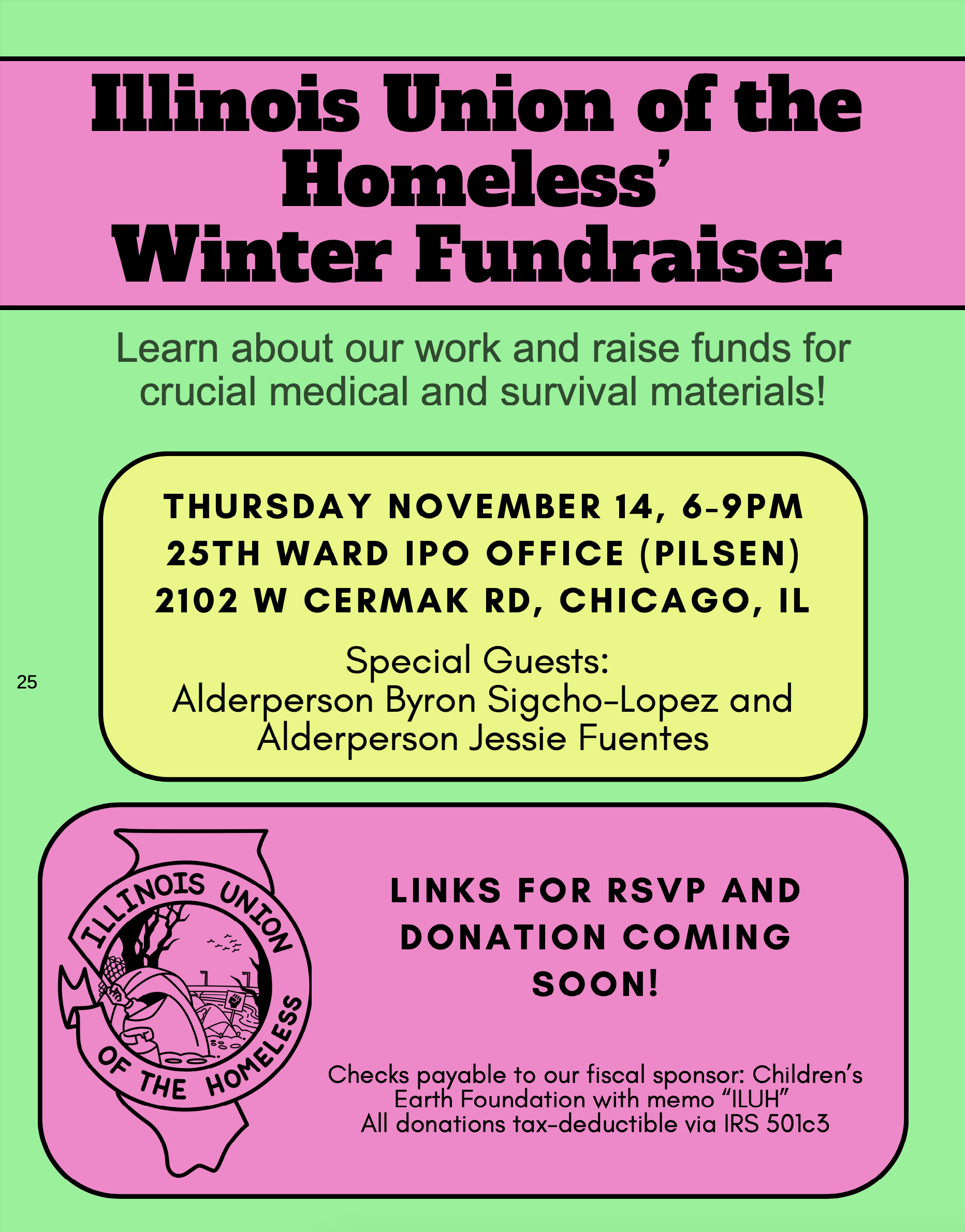This is a fundraiser for the Illinois Union of the Homeless to raise money for the Winter Offensive. Please join us and donate to help us work to end homelessness! The fundraiser is on Thursday, November 14th from 6 to 9 pm at the 25th Ward IPO Office, 2102 W Cermak Rd, Chicago, IL 60608.