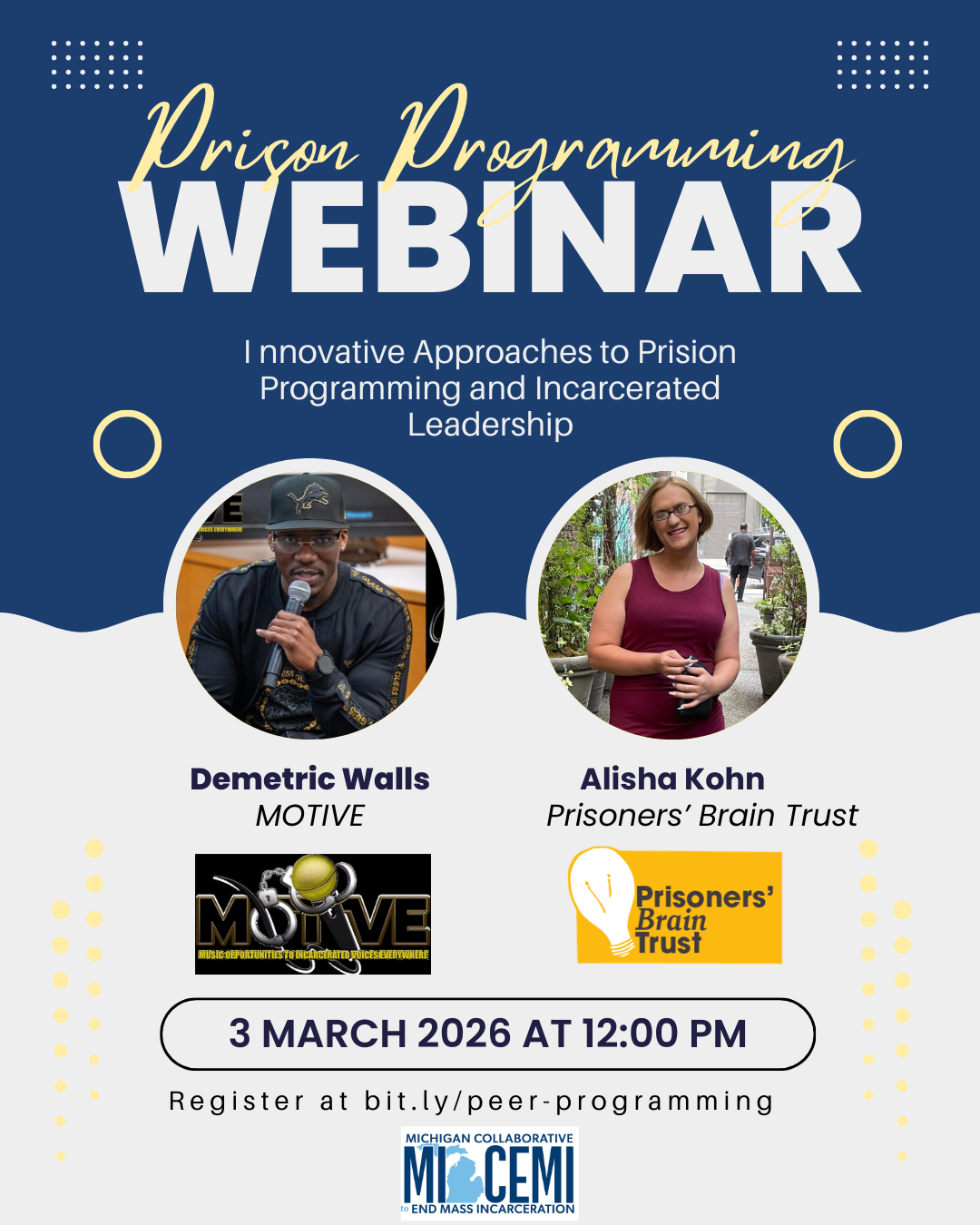 oin us March 3rd from 12:00–1:30 PM (ET) on Zoom for the MI-CEMI Prison Programming Providers Table, featuring Demetrius Walls of MOTIVE (Michigan) and Alisha Kohn of Prisoner Brain Trust (New York) in a peer-led conversation on how incarcerated leadership and innovative program models are bridging gaps, restoring hope, and driving community change.