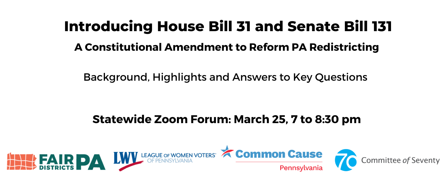 Join Fair Districts PA and partner organizations for a Zoom event introducing the PA constitutional amendment to reform redistricting. Hear more about the background of the bill and provisions to ensure independence, public input and transparency, and prioritized criteria.