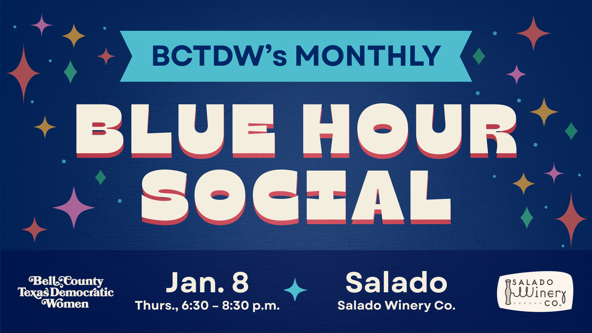Join BCTDW for our Blue Hour Social on Thursday, Jan. 8 at 6:30 p.m. in Salado at the Salado Winery Co. for a fun evening of casual conversation with like-minded folks (sometimes including a candidate or two)!