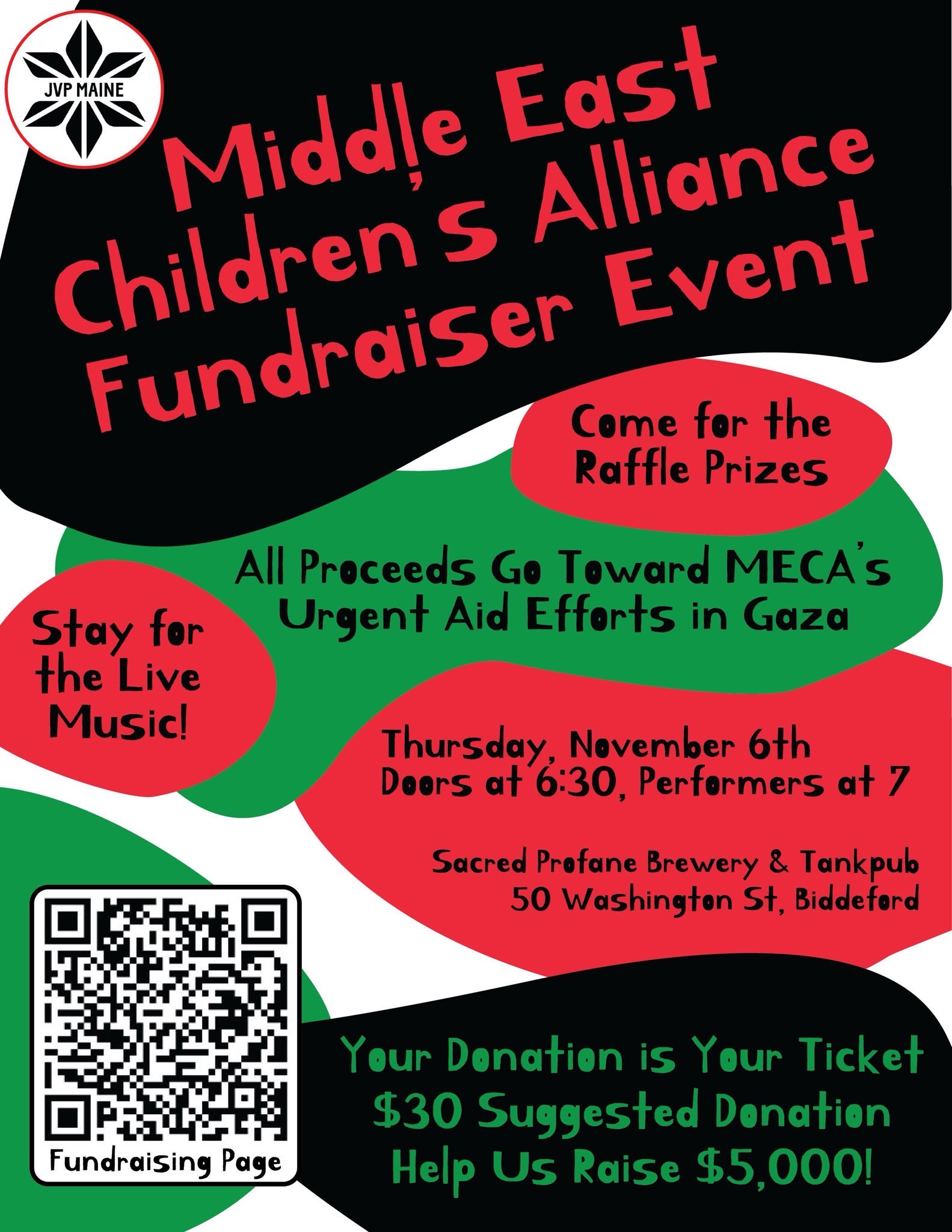 Jewish Voice for Peace Maine is raising funds for the Middle East Children's Alliance to provide urgent aid to children & families in Gaza. MECA's staff and local partners in Gaza are on the ground responding to the most urgent needs of children and families.