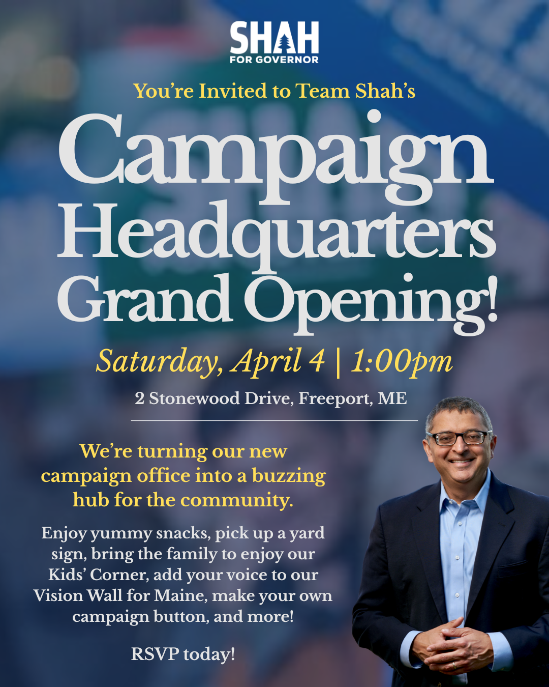 Location: Team Shah Campaign HQ• 2 Stonewood Drive, Freeport, ME 04033 US