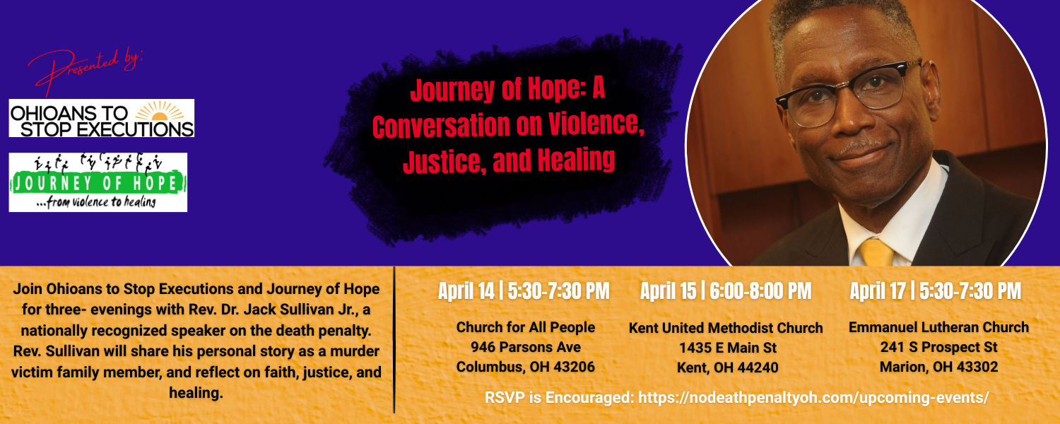Join Ohioans to Stop Executions and United Methodist Church for All People for the Columbus stop of our Journey of Hope Ohio Mini Tour with Rev. Dr. Jack Sullivan Jr., on Friday, April 17 from 5:30 PM to 7:30 PM.