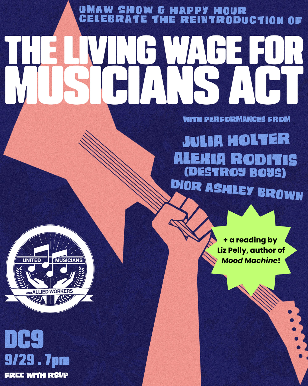 Join UMAW on September 29 in Washington D.C. at DC9 for a show with full performances from Julia Holter, Dior Ashley Brown, Alexia Roditis (from Destroy Boys), and a reading from Liz Pelly, author of Mood Machine: The Rise of Spotify and the Costs of the Perfect Playlist.
