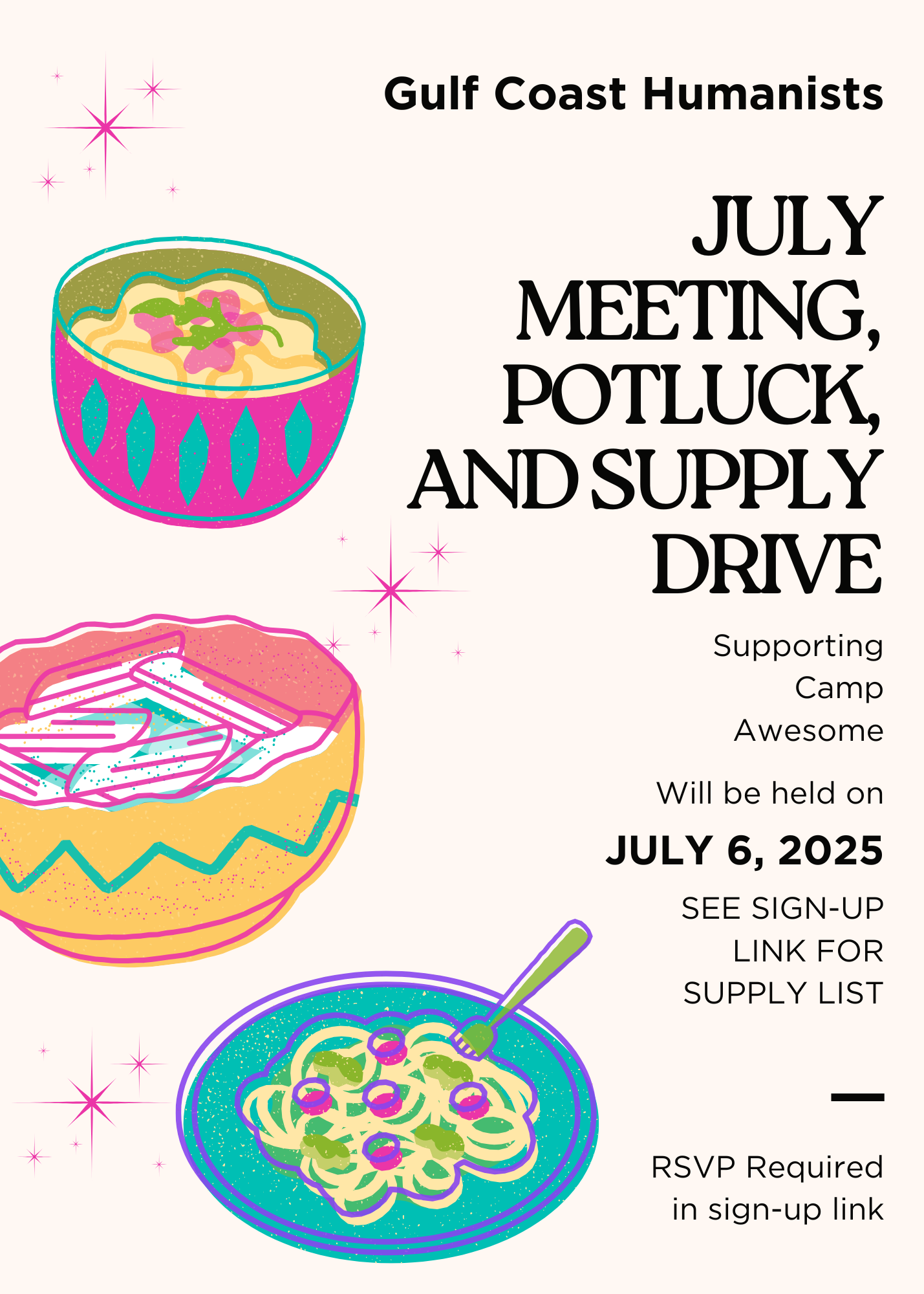 Join us for our July Meeting and Potluck! Come learn more about Humanism and make some new friends. Please bring needed supplies to donate to Camp Awesome, which is a Biloxi summer camp for disabled kids and disabled adults. To see instructions for the event and the supply list, please RSVP.