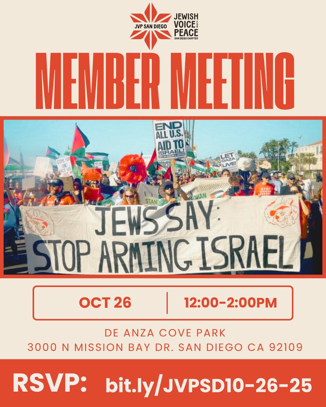 Please join JVP San Diego on Sunday, October 26th at 12 PM for our bi-monthly member meeting in De Anza Cove Park. We'll start with a potluck (please bring your favorite dish and beverages) and then discuss strategies and work being done within our committees: Political Advocacy & Education, Community Building and Outreach, Communications, Website, Art, and Media, and Finance.