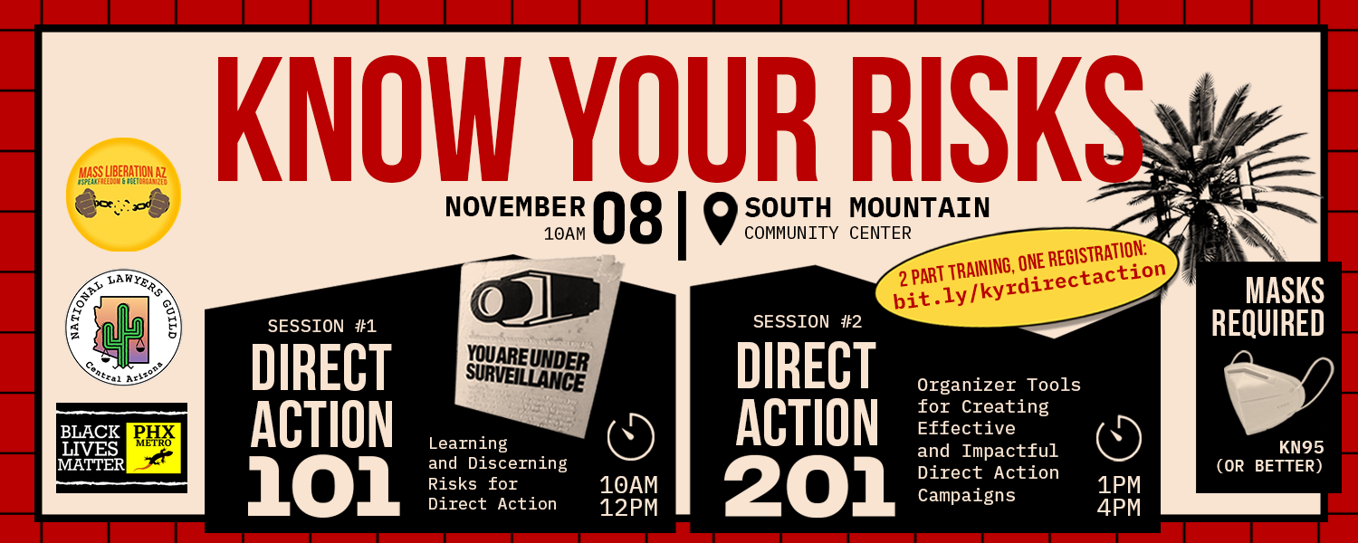 Join us for two building-block sessions focused on understanding and preparing for the risks associated with direct action organizing. Participants will gain historical and present-day context, learn to discern their own levels of risk, and explore strategies for building effective and impactful campaigns. Here's a breakdown of the training: