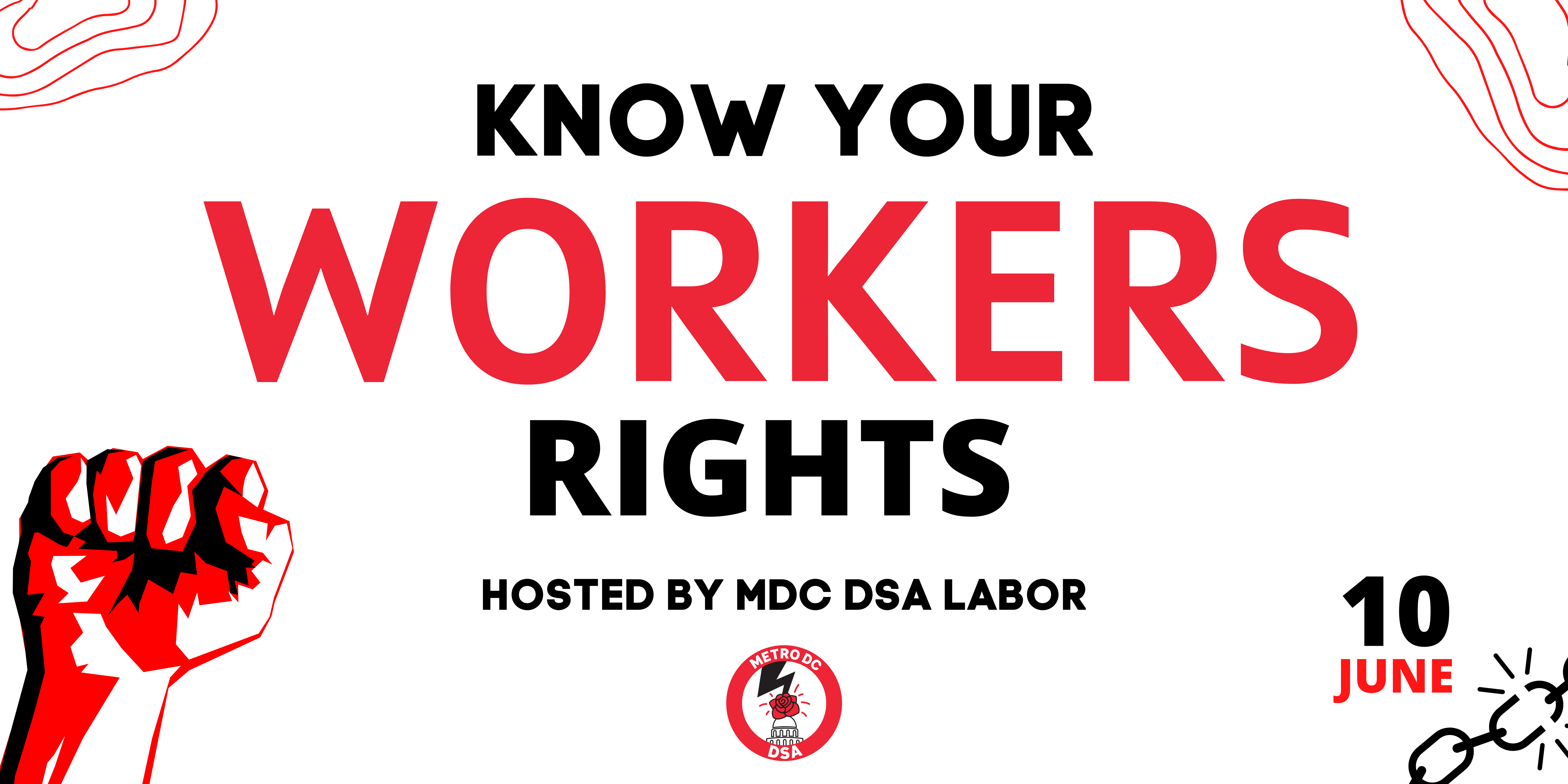 Join MDC DSA Labor Working Group for a "Know Your Rights" session on worker's rights in DC. We will be going over the key laws protecting workers in regards to sick days, paid time off, overtime, harassment, and more! After this workshop attendees will understand how wage theft can manifest in the workplace and what to do if they find themselves victim to this practice.