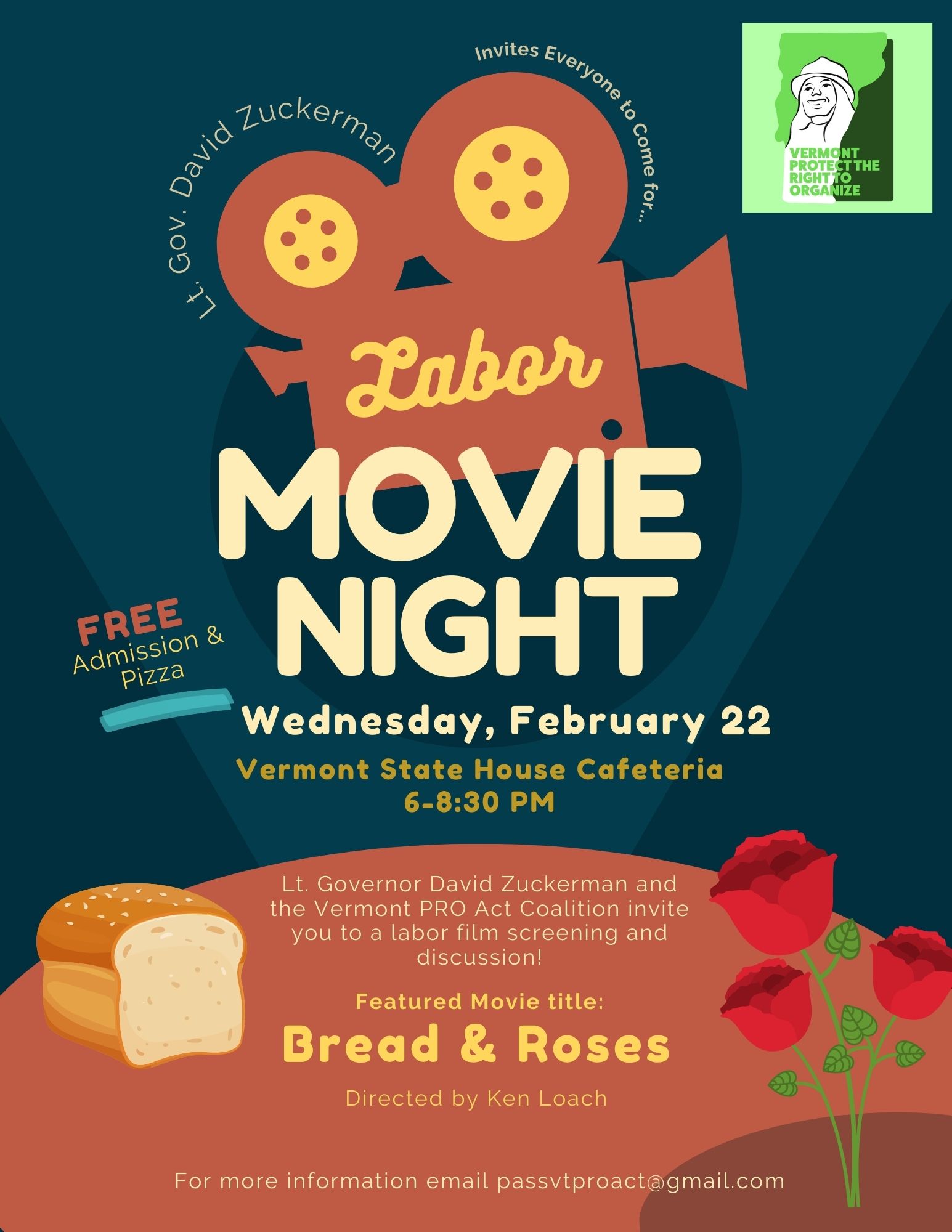 What: Film screening of Bread & Roses followed by a discussion of the Vermont Protecting the Right to Organize "PRO" Act