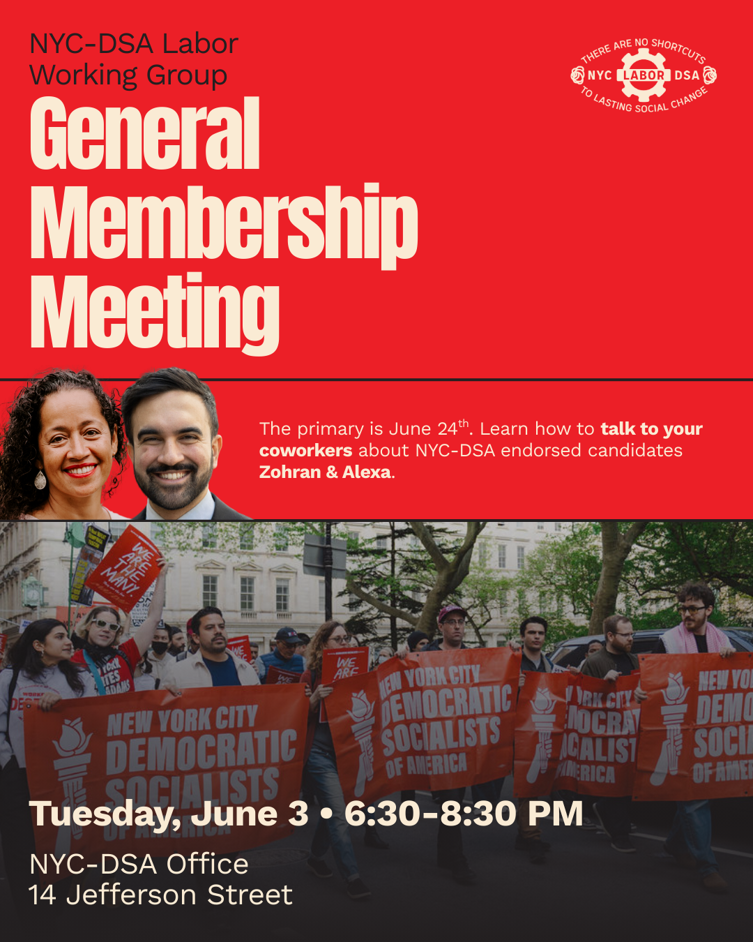 Join us for the quarterly NYC-DSA Labor Working Group (LWG) General Membership Meeting (GMM) on Tuesday, June 3, 6:30 – 8:30 PM, at the NYC-DSA Office (14 Jefferson St in Lower Manhattan) + Zoom.