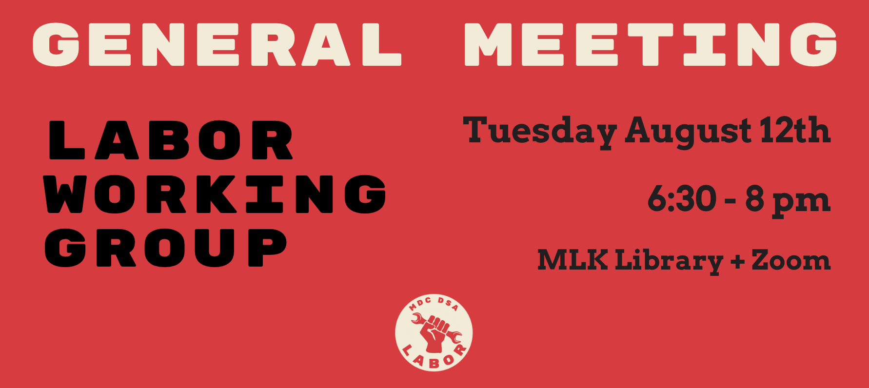Join MDC DSA Labor for our August working group meeting. At this meeting, we will be discussing updates from ongoing labor campaigns, identifying action steps for solidarity, and sharing opportunities for further organizing.