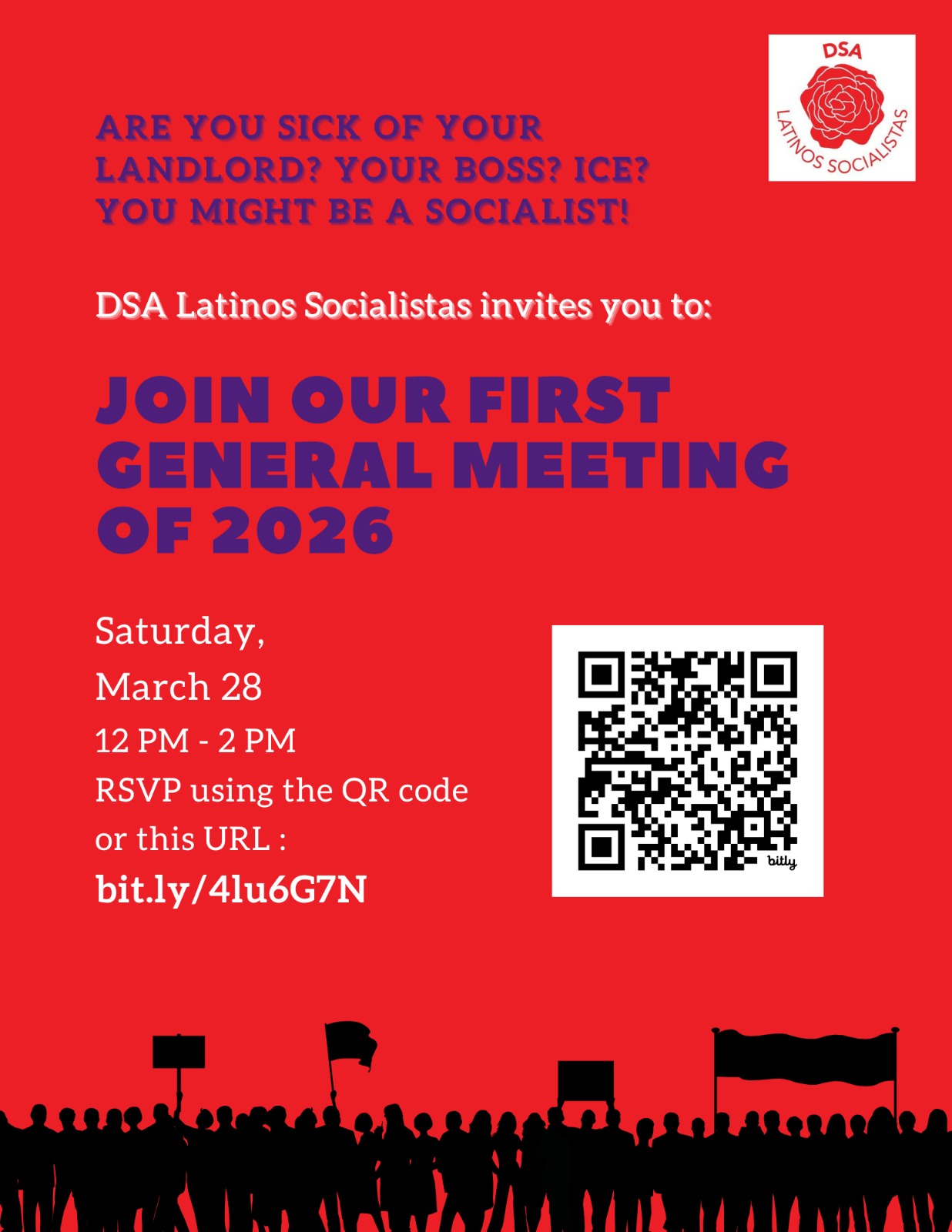 So, if you are a DSA member seeking a latine/a/o space, or a DSA curious and want to meet likeminded compas, consider joining us! Please, share this event and invite your friends, family, neighbors and co-workers.
