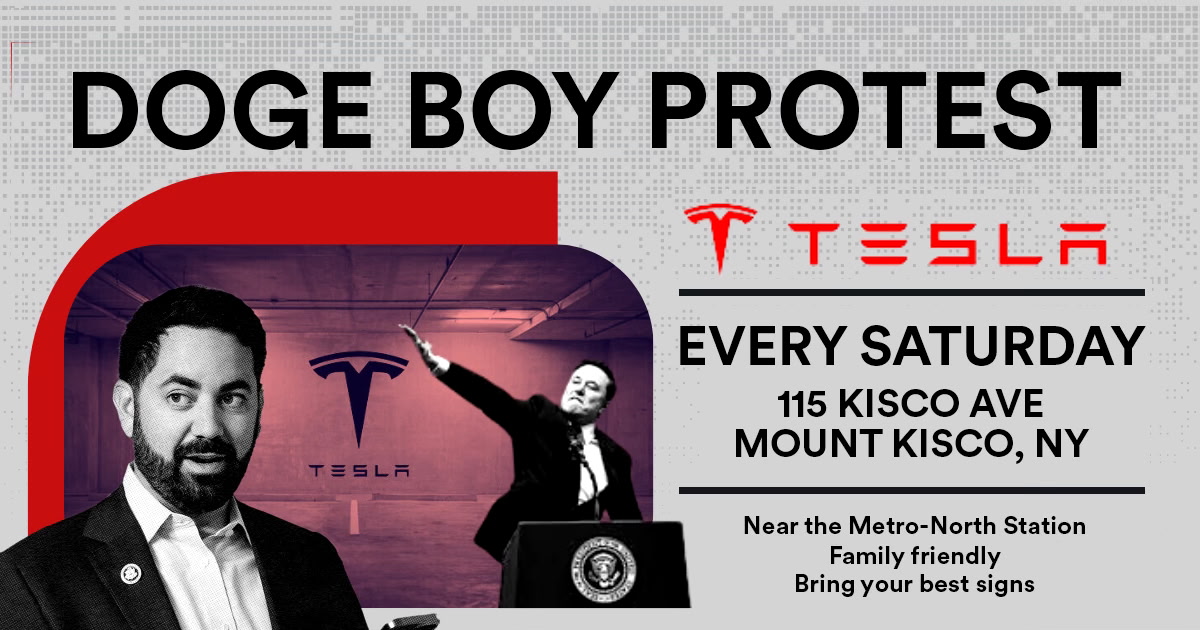 We are taking action at this Tesla-owned dealership. We are asking people to line the sidewalks in front of the dealership in a peaceful protest. This dealership is a few blocks from the MetroNorth station in Mt Kisco. We will be there from 1 to 3 p.m. on Saturdays. Bring a sign (a folding chair if you want) and warm clothes. Bring the kids.