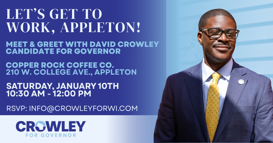 Join Milwaukee County Executive David Crowley for a Meet & Greet in Appleton! Stop by for a casual conversation to learn more about David and his campaign to be the next Governor of Wisconsin.