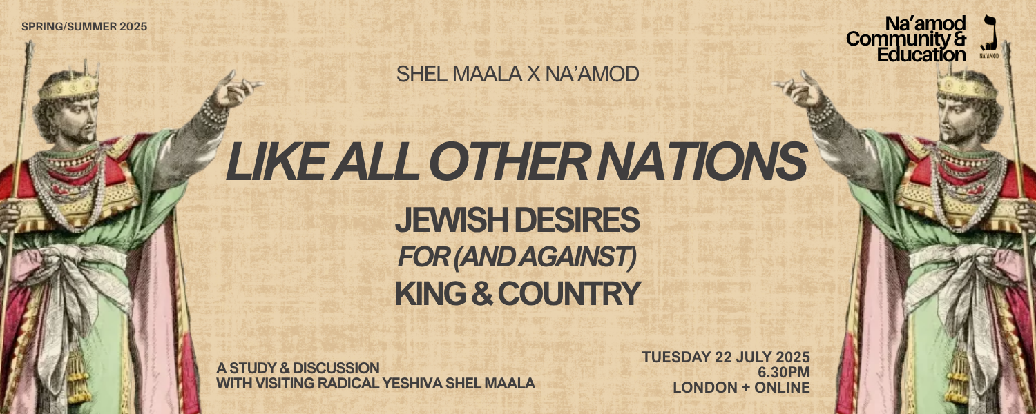 Shel Maala, the radical online queer Yeshiva, returns to London after last year’s sold-out Havdallah gathering and online “Torah for Liberation” study sessions with Na’amod — this time to teach an evening on Jewish desire for, and resistance to, earthly power. Co-teachers Binya Kóatz and Rabbi Xava De Cordova will guide us through a dynamic exploration of Jewish political imagination.