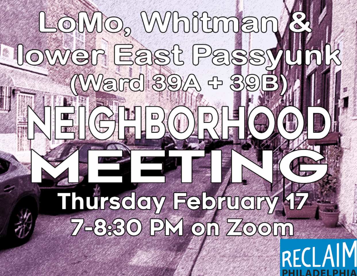 Reclaim Philadelphia’s next neighborhood meeting for LoMo, Whitman, and lower EPX (39th Ward) will be Thursday, February 17 at 7 pm on Zoom. At this meeting, we’ll hear from a representative of the Lower Moyamensing Civic Association, plus an update on the upcoming primary and committee person candidate recruitments, a look ahead to the budget fight, and ways to hold our leaders in City Council accountable. We hope you can join us!