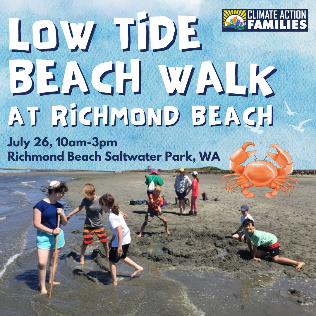 Join Climate Action Families for our annual Low Tide Beach Adventure — a beloved summer tradition for families to explore the wonders of the Salish Sea together!