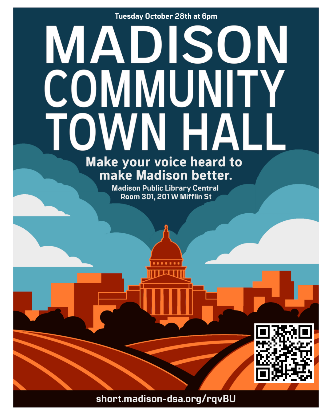 Madison DSA invites the Madison community to an open discussion of social and political issues YOU care about in our city. This Community Town Hall aims to facilitate dialogue and encourage fellow residents to take action to make Madison better and preserve what we already love. Come ready to share your voice. All are welcome.