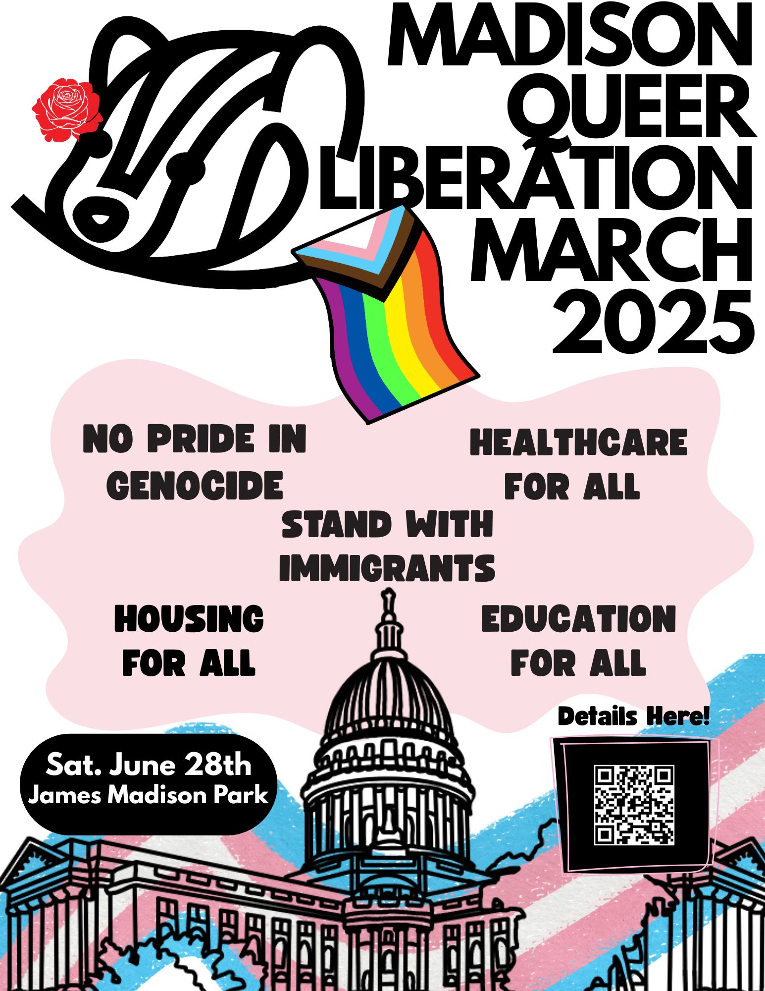 On Saturday, June 28th at 10am, Wisconsinites will gather in James Madison Park and march to the Capitol to demand Queer Liberation for All! Those who can’t march can meet us in the Capitol at 11:45am using accessible entrances.