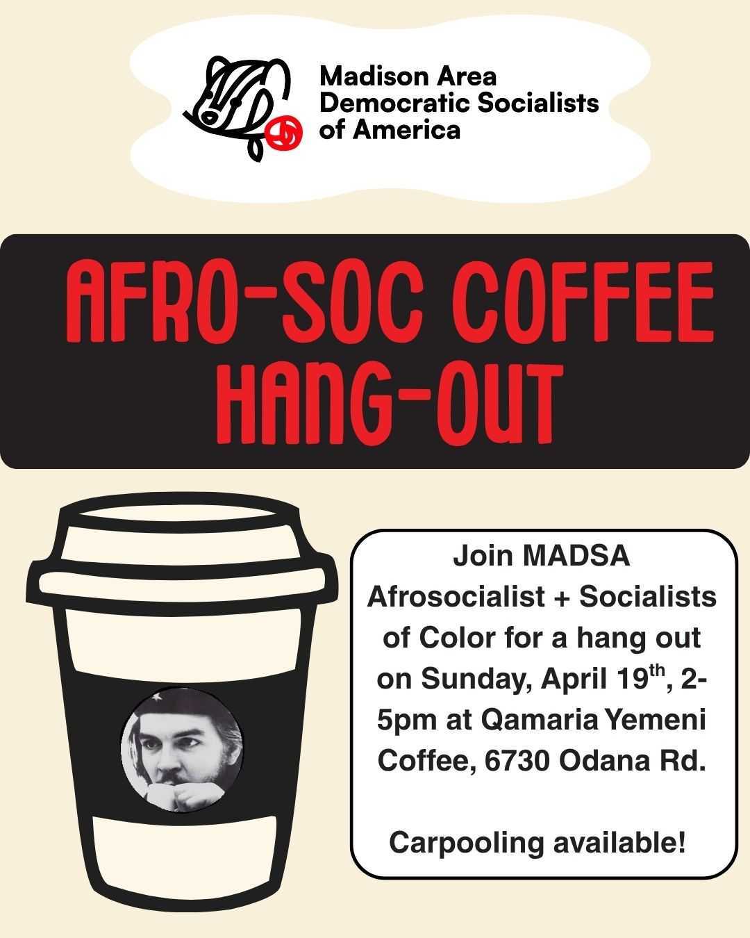 Introducing the first Madison Area DSA Afrosocialists coffee hangout! Come hang out with other socialists of color at Qamaria Yemeni Coffee on Odana Rd and bring your friends! This event is open to other Madison DSA members and to the wider community.