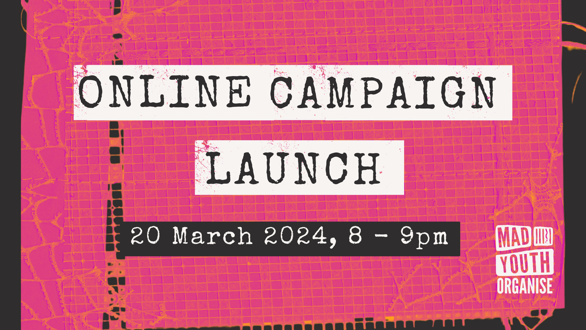 The launch is happening on Zoom at 8pm on Thursday 20th March. We will be running through our campaign plan to win, as well as our grassroots generated "Mad Youth Manifesto". We'll also be highlighting all the ways that people can take action as part of the campaign.